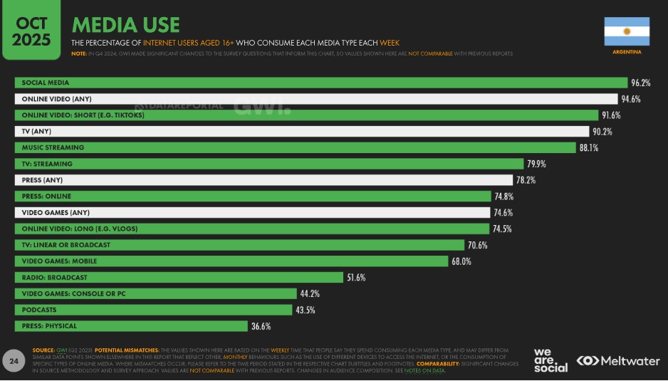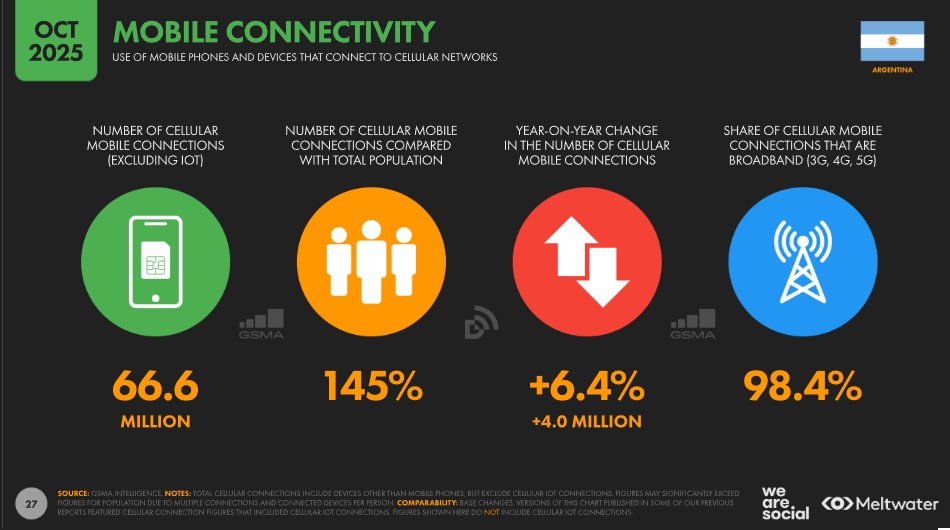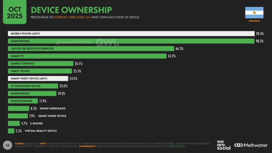 El informe anual de We Are Social y Meltwater sobre el campo digital también incluye la Argentina. A continuación se ofrecen datos del informe puntual de Argentina y de del informe sobre el país que surgen del informe global. El smartphone es el dispositivo que sigue siendo el predilecto para acceder a Internet.