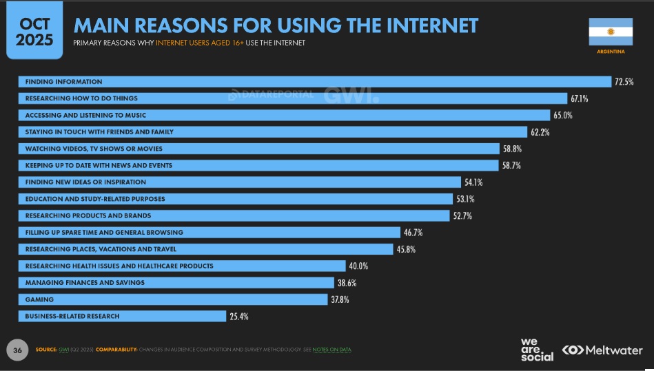 La principal búsqueda en Internet es sobre información en general. Recién en sexto lugar se encuentra el acceder a noticias.