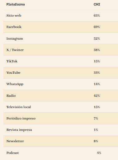 El campo digital es la principal plataforma de las noticias en Chile. Se destacan los sitios web propios de los medios así como redes sociales como Facebook, Instagram, YouTube, X o TikTok. Entre los soportes tradicionales se destaca la radio.