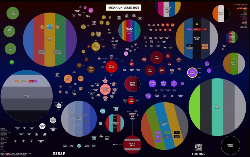 El consultor Evan Shapiro publica todos los años su atlas de contenidos. Es destacable y valioso de sus datos que no sólamente incluye medios tradicionales, redes, buscadores y ahoraa softs de inteligencia artificial, sino que también incorpora el hardware. Este es su mapa para el 2026.